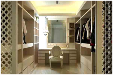 更衣室的設計規劃應考慮五金配件的選用,是保證設計品質的重要環節,而一個完善的更衣室機能應具備轉衣架、領帶架、下掛式掛桿、內置傾斜式鞋架等等人性化的配件,其中旋轉式掛衣架不僅能節省空間且存掛量大,是傳統式衣櫃的2-3倍。
