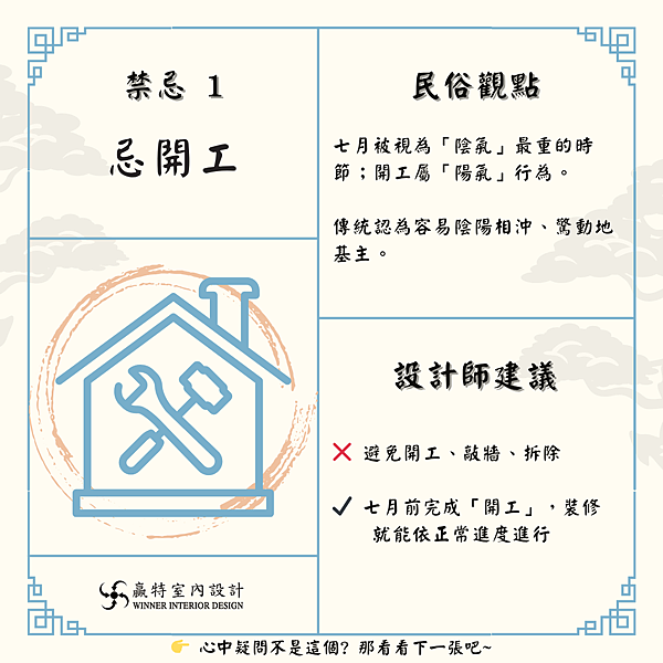 鬼月期間並非不能裝修,而是不宜「開工」,建議開工動作提前完成,之後就能依正常進度裝修,無須全月停工囉~